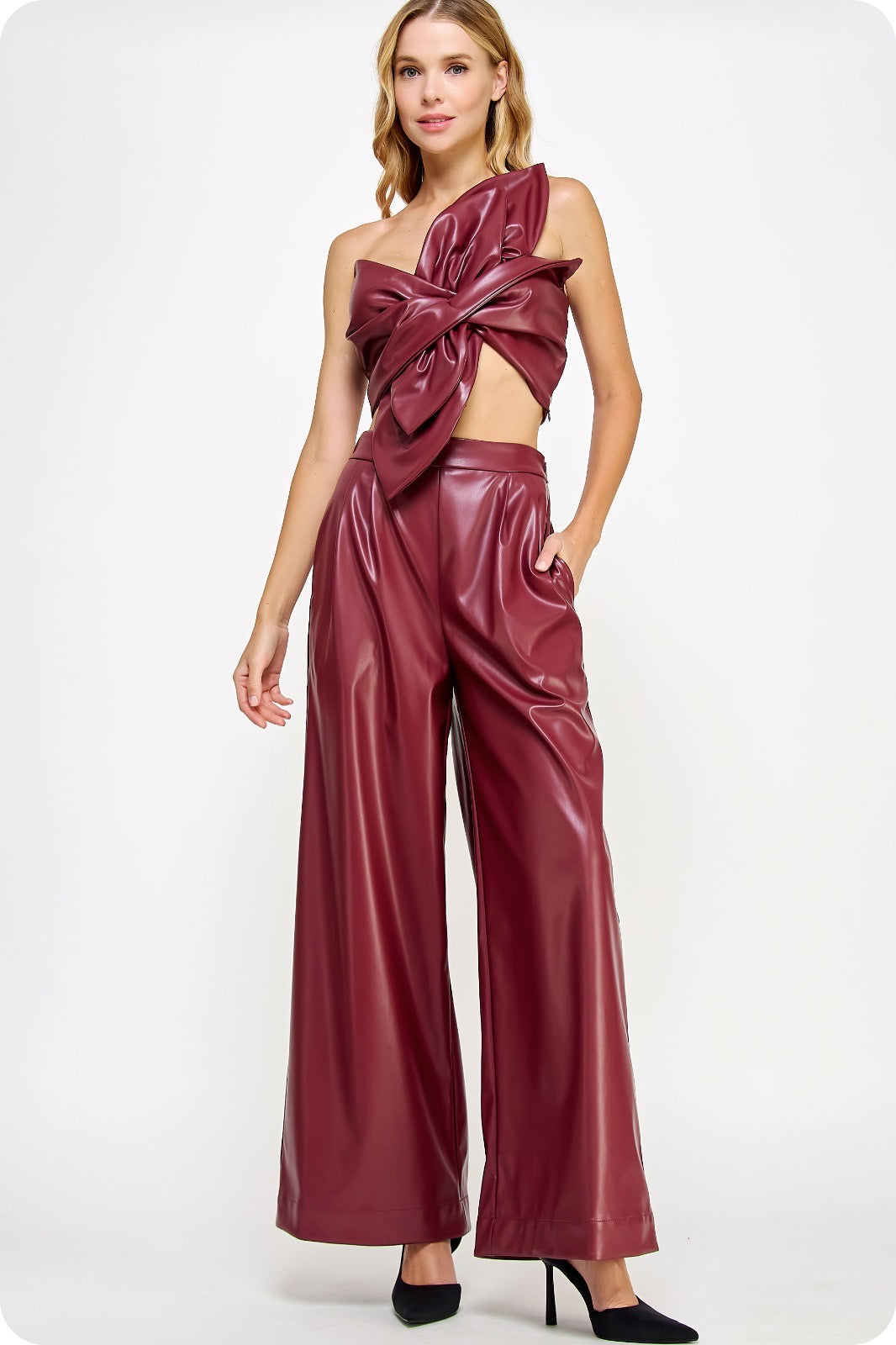 The wide-leg pants complement the bralette beautifully, offering a relaxed yet fashionable fit that elongates your legs and creates an effortlessly elegant look. Perfect for a night out, a concert, or a fashionable event, the Daring Duo Leather Set is designed for those who dare to stand out.