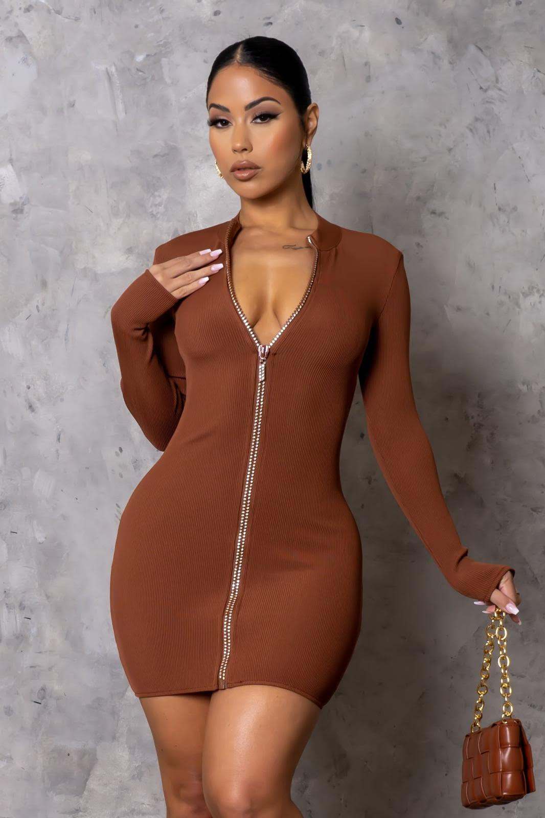Elevate your baddie style with the Baddie Zipdown Dress, a sleek and sexy ribbed mini dress designed to hug your curves in all the right places. This fitted dress, available in a rich brown hue, features a rhinestone-embellished centerline zipper that runs from top to bottom, adding a glamorous sparkle with an edgy twist.