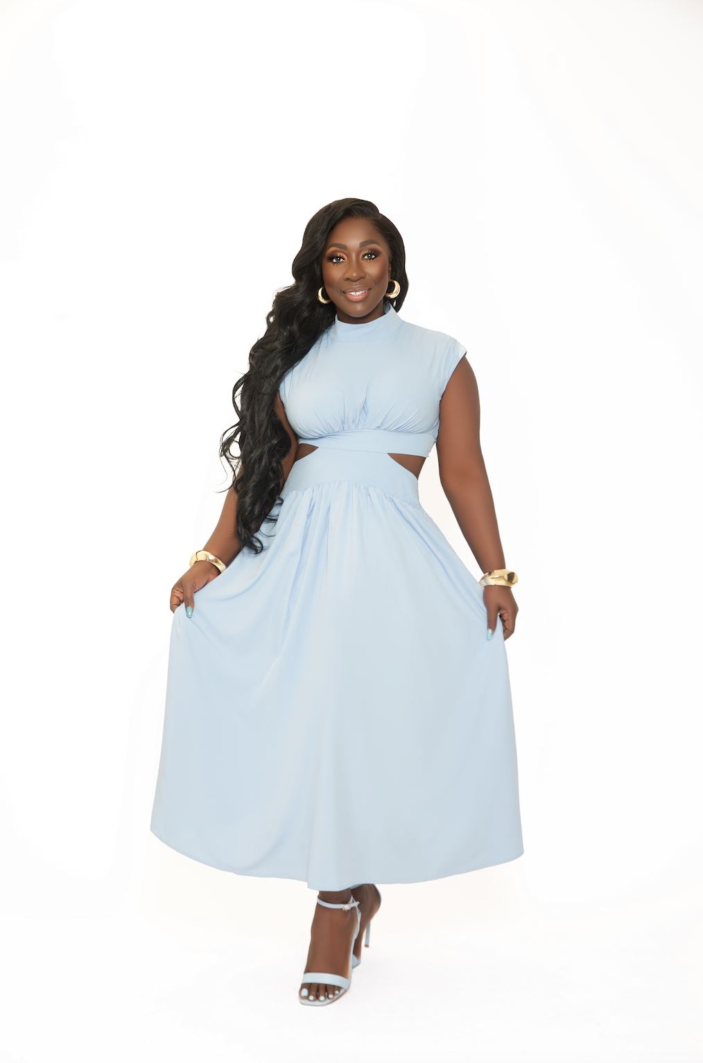 Fit for a modern princess. This sleeveless dress features a flattering cutout waistline, pleated skirt, and soft blue hue. Dreamy and graceful for brunches, showers, or garden parties.