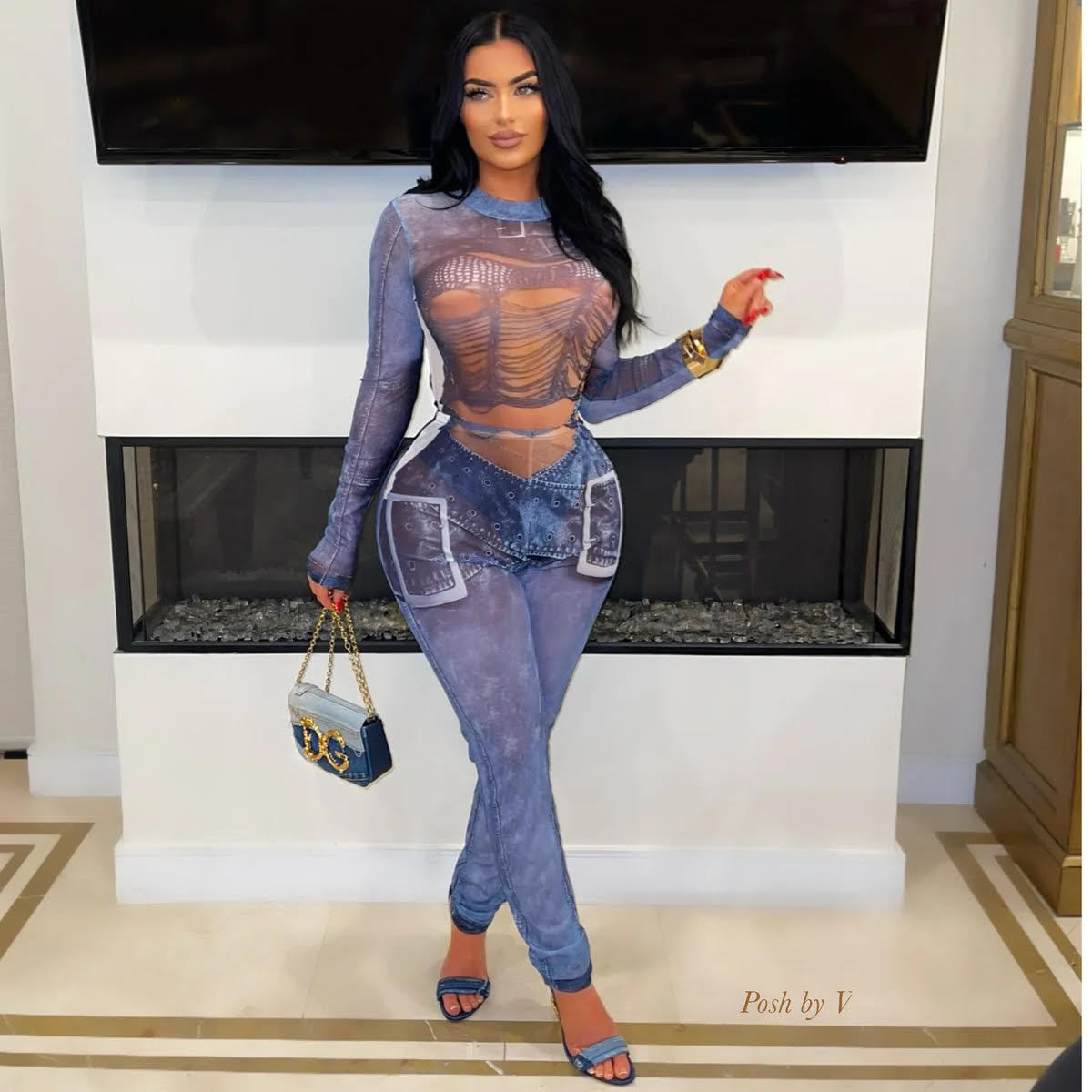 The crop top showcases an eye-catching print that mimics a ripped denim shirt, complete with faux cut-outs that reveal glimpses of skin, adding a daring touch to your outfit. The stylish leggings feature a printed illusion of trendy belt buckles at the waist, enhancing your silhouette while delivering that edgy vibe.