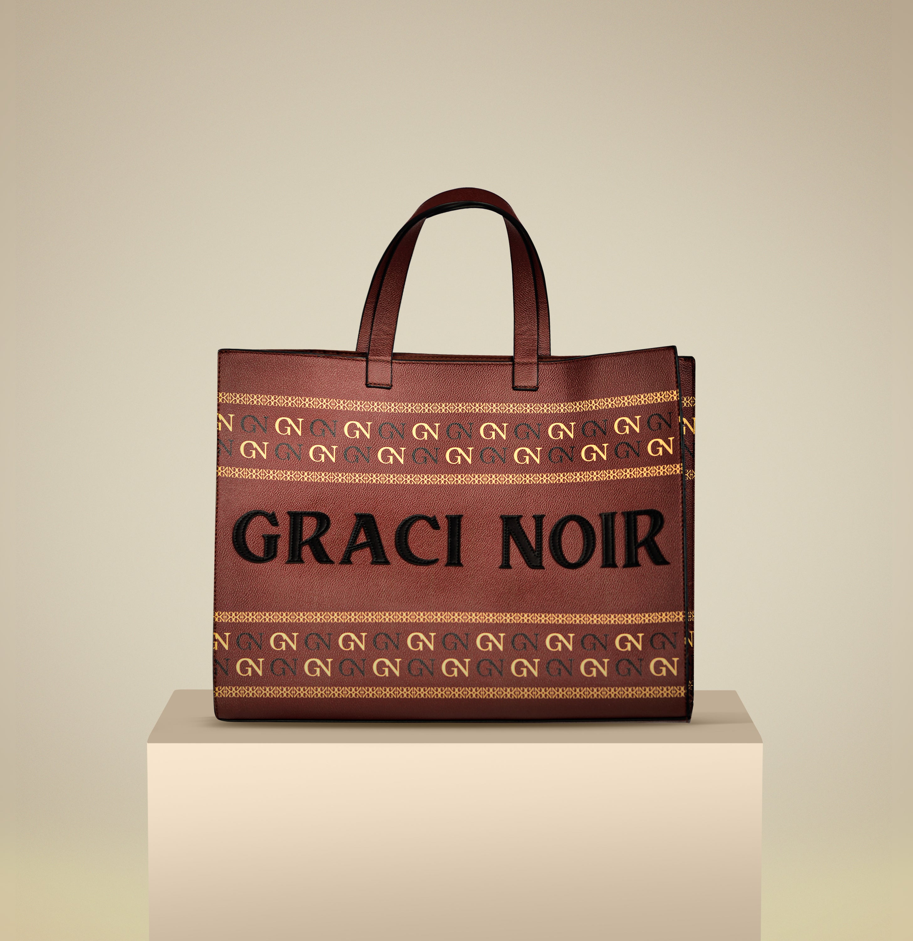 Spacious yet sophisticated, the GN Monogram Tote is the ideal companion for any occasion, adding a luxurious touch to every look this tote also displays a striking black Graci Noir logo along the side, making it a true statement piece. The GN Monogram Tote is a luxurious companion for any occasion.