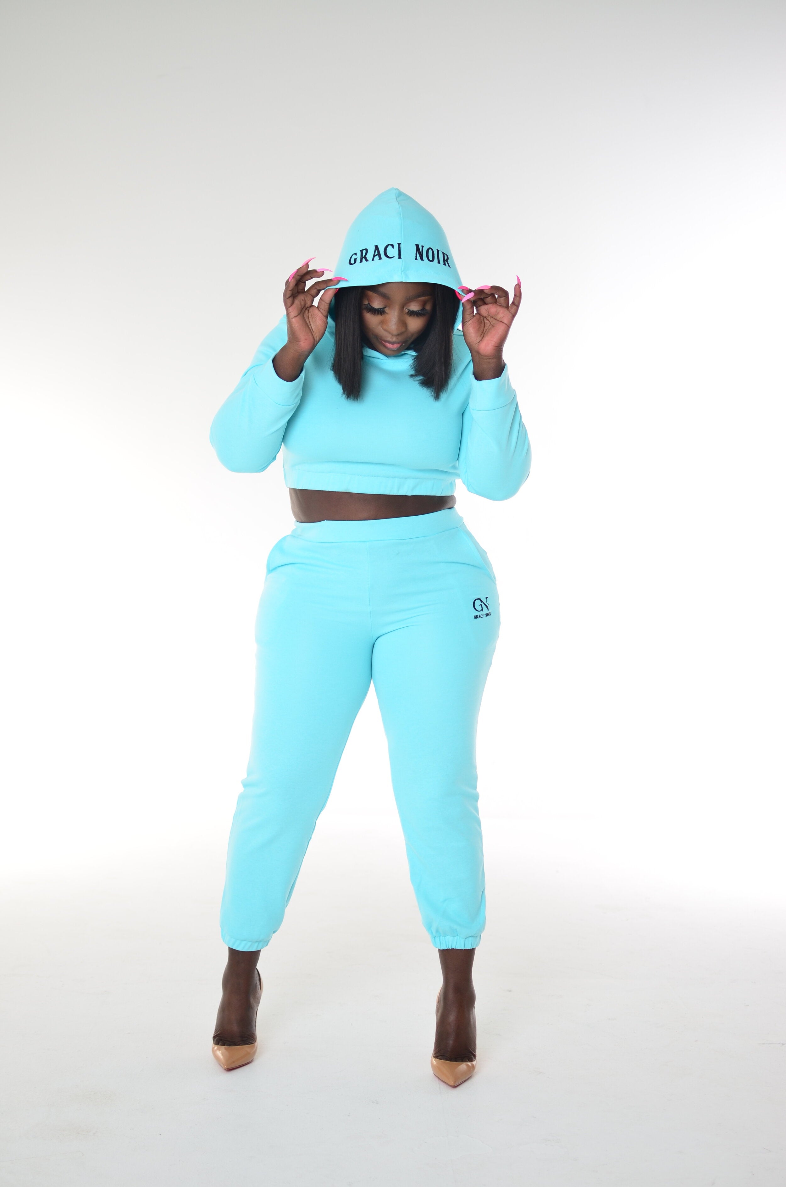 The Graci Noir Signature Cropped Jogger Set is a perfect blend of comfort and elevated style. This two-piece set features a cropped pullover hoodie with the Graci Noir name subtly placed on the front, paired with matching joggers where the branding is positioned on the top right pant leg. Available in ocean blue, lime green, and nude/tan, the long sleeves and high-waisted joggers offer a sleek, flattering fit, making this set versatile for both lounging and casual outings. The Signature Cropped Jogger Set embodies the modern, effortless aesthetic of Graci Noir.