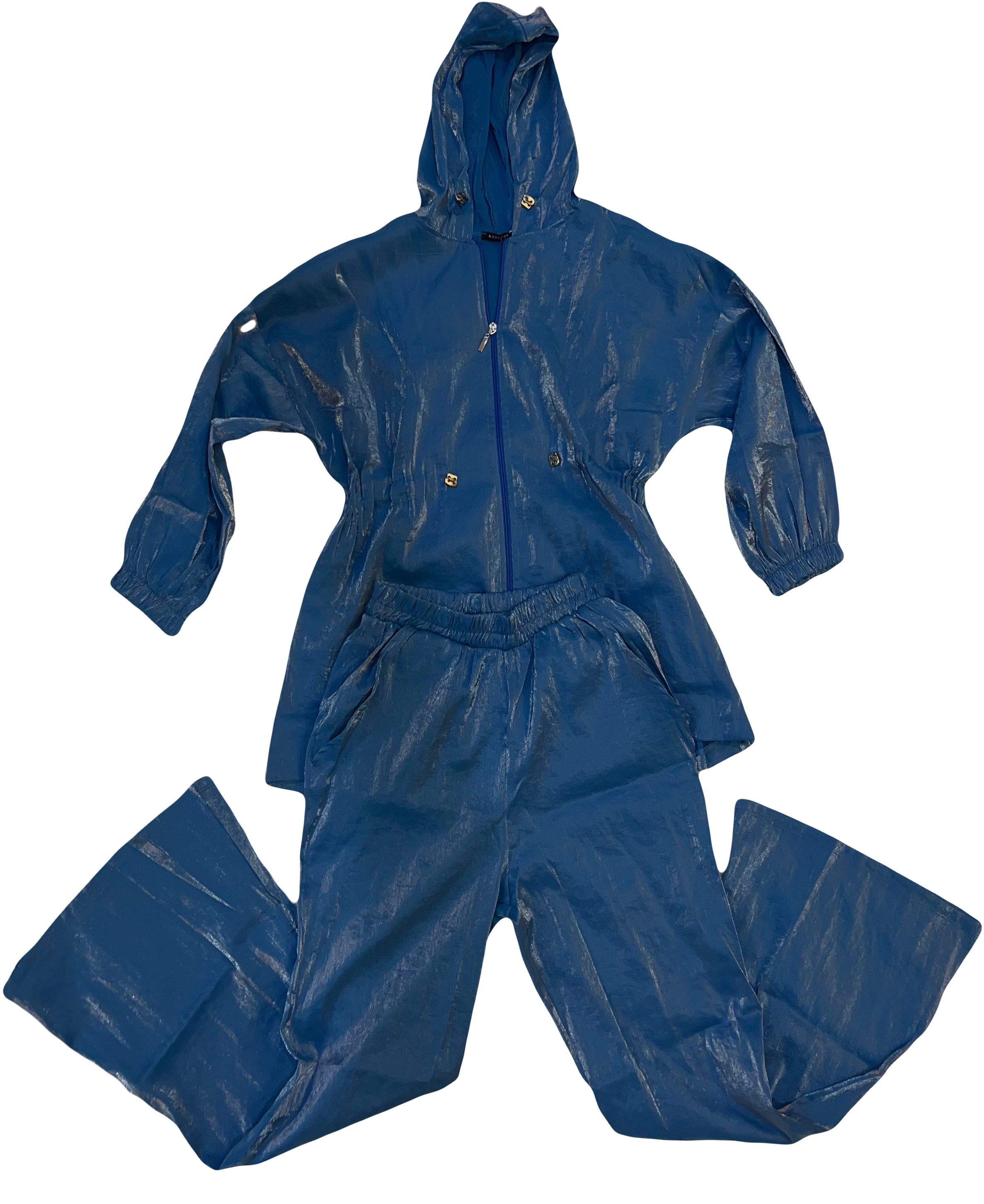 Elevate your athleisure game with the Luxe Skyfall Windbreaker Set. This stunning light blue ensemble features a sleek windbreaker jacket and matching pants, designed for both functionality and style. Crafted from a shiny, high-quality material, this set effortlessly captures the essence of modern luxury while providing ultimate comfort.