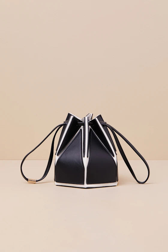 Elevate your accessories game instantly with the Mini Panda Tote Black and White Color Block Bucket Bag! Smooth leather, in contrasting hues of black and white in a geometric-style design, shapes this structured bucket bag with a flat bottom silhouette and a unique drawstring top that cinches with slender, twin tote handles.