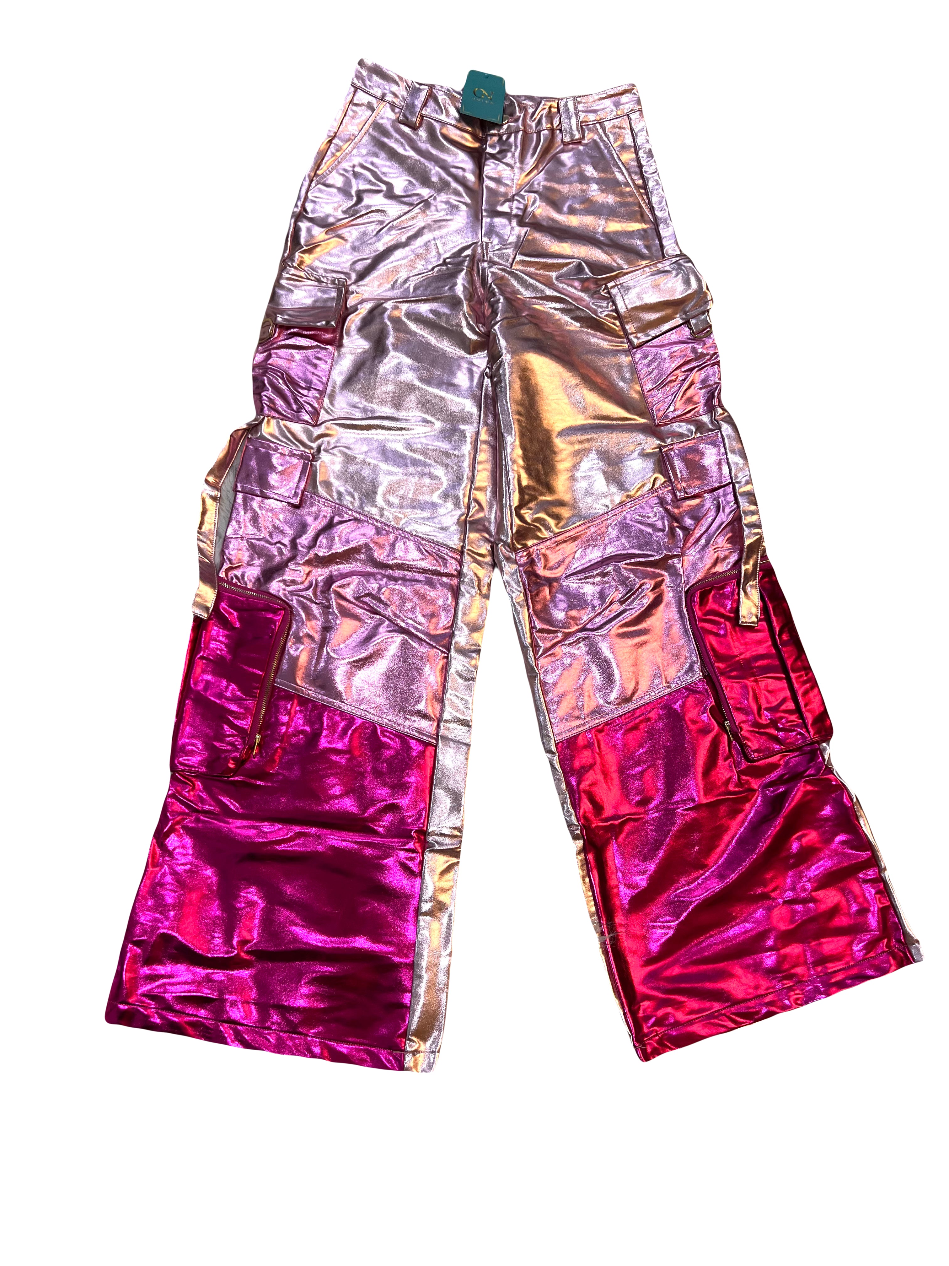 Step into style with the Pink Stardust Cargo Pants! These charming pink metallic cargo pants are perfect for the fashion-forward girl who loves to shine. The iridescent fabric catches the light with every move, adding a sprinkle of magic to your outfit.