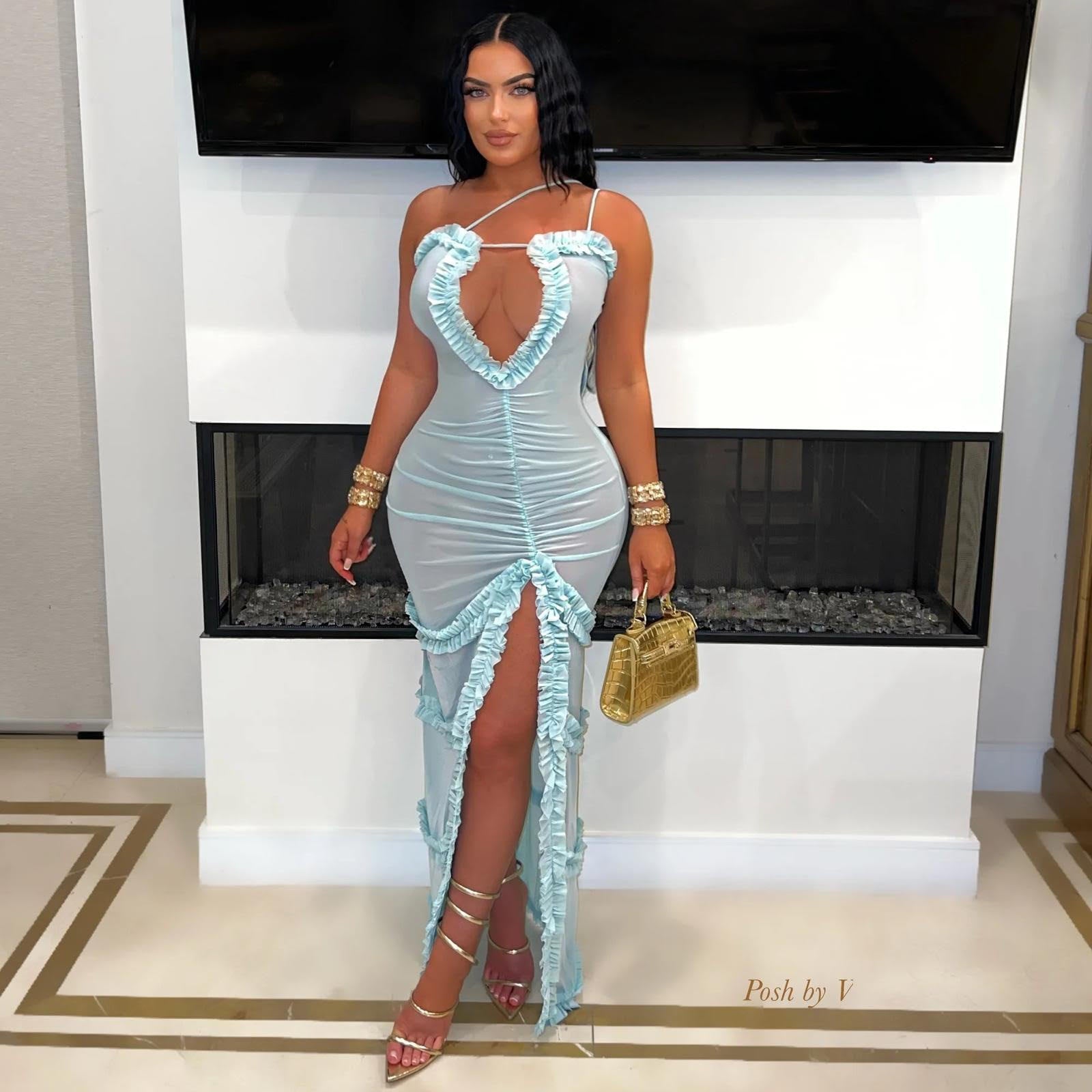 The top half features an open, daring design with delicate ruffle detailing that adds a flirty touch, while the high split to the thigh gives a sultry glimpse of leg, ensuring you make an unforgettable entrance. The form-fitting style accentuates your curves, and the dramatic slit adds movement and sexiness to your stride. Perfect for upscale evenings or special occasions, the Ruffle Me Maxi Dress is all about bold elegance and undeniable glamour.