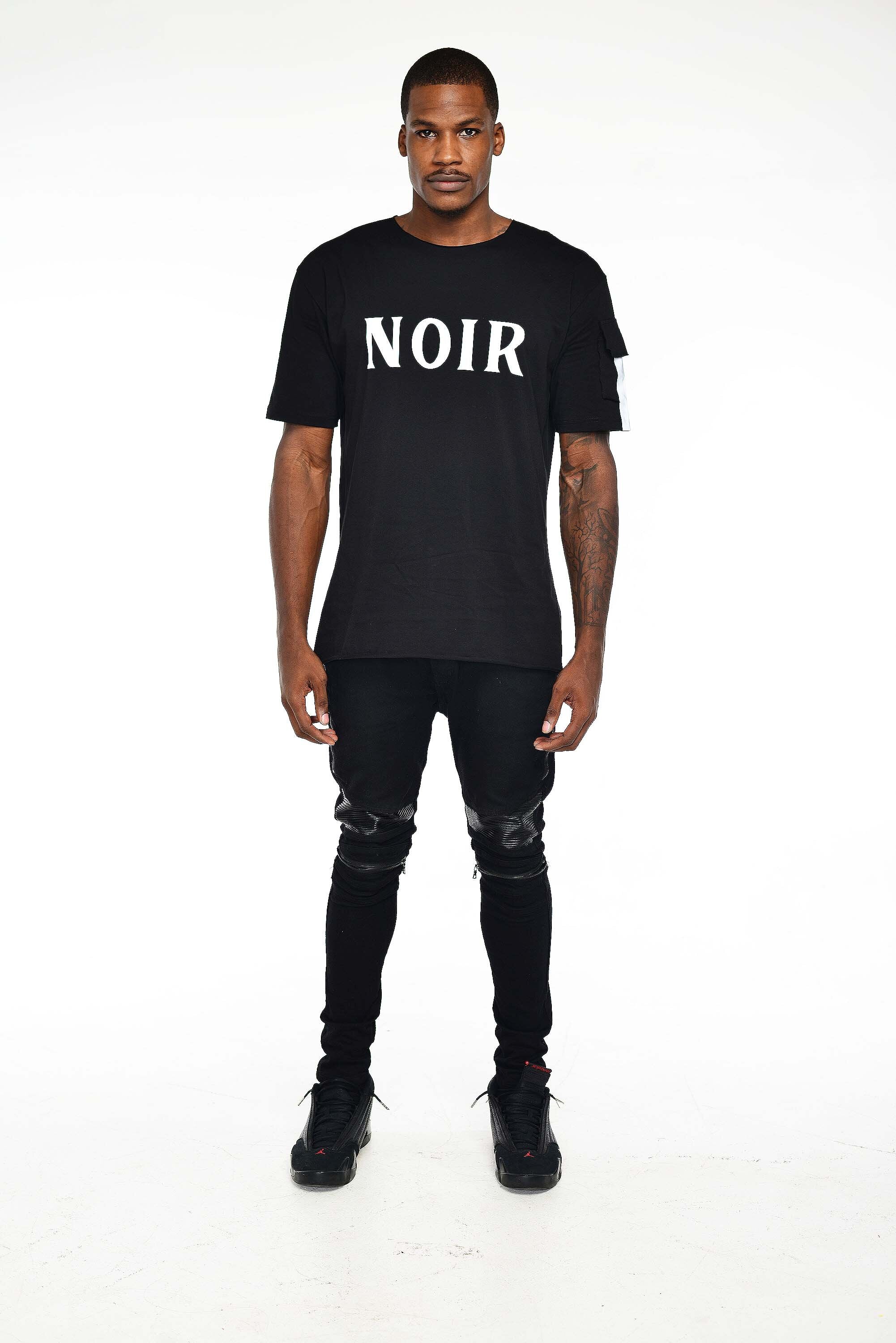 Bold Noir black shirt with left pocket on the side and white strip on the back.